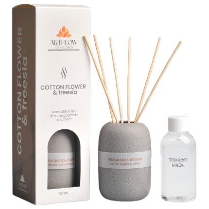 ArtFlow aromātiskā eļļa Cotton Flower & Freesia ar rotangpalmas kociņiem ir izsmalcināts gaisa atsvaidzinātājs, kas piešķir mājoklim elegantu atmosfēru. Šajā komplektā ietilpst dabīgi rotangpalmas kociņi un kvalitatīva aromātiskā eļļa 120 ml. Pateicoties inovatīvajam dizainam ar keramisko trauku, difūzers harmoniski iekļausies jebkurā interjērā, vienlaikus nodrošinot ilgstošu un vienmērīgu smaržas izplatīšanos telpā 4 – 6 nedēļu garumā. Produkts ir viegli lietojams – vienkārši ielejiet aromātisko eļļu traukā, ievietojiet tajā rotangpalmas kociņus un regulējiet aromāta intensitāti, pagriežot kociņus pēc nepieciešamības.