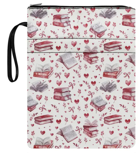 Baltas krāsas grāmatas motīvā izveidota soma , mazgājams un izturīgs audums, sirds un grāmatas apdrukas dizains, ideāli piemērots skolai, studentiem, skolotājiem un grāmatu cienītājiem.